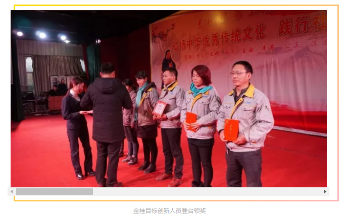 大會開始,伴隨著歡快的掌聲和音樂,人力資源部應主任對第三季度《金桂目標》中的14個創新項目成果一一進行了宣讀匯報,本次的14項創新成果經過現場的實際使用驗證,切實解決了許多生產中的實際問題,產生良好的經濟效益,激發了一線人員的創新思維和參與熱情,整體創新價值高。在全體人員的熱烈掌聲中,企管部劉書記、制造部孫副總和研究所豆副所長分別對本次在創新改善中獲獎的員工進行了表彰頒獎和合影,并親切鼓勵各位家人們能再接再厲,再創佳績。